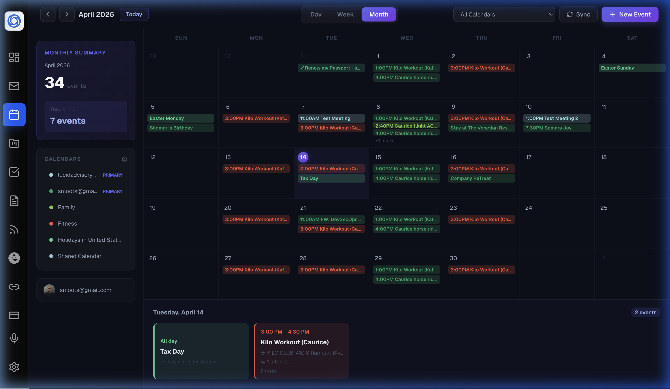 - Color-coded calendar groups (Primary, Family, Fitness…)