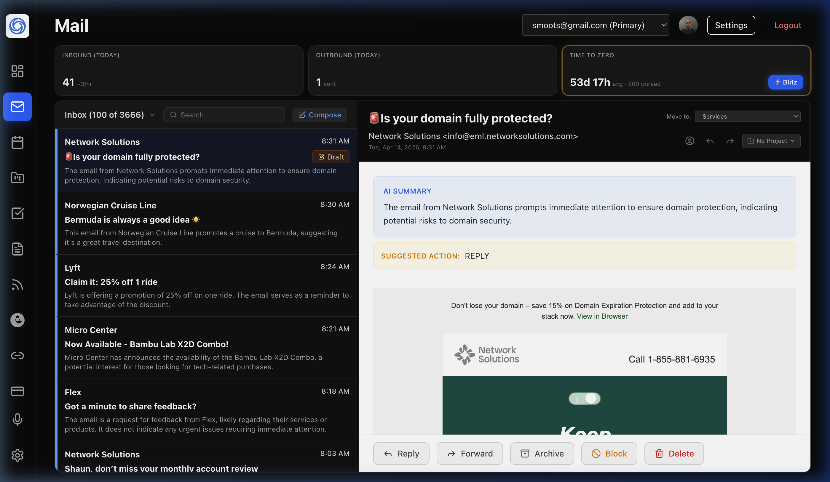 LUCI brings AI summaries, suggested actions, and priority scoring to every email thread. With Blitz Mode, blast through hundreds of messages in minutes — never feel buried again.