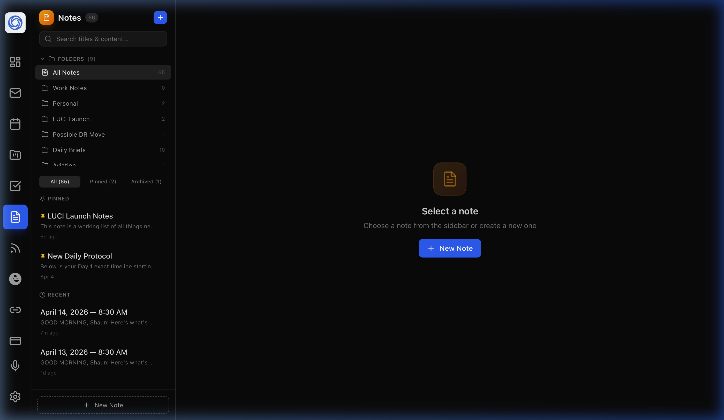 A powerful notes module with folders, pinning, full-text search, and rich markdown editing. Daily AI briefings are automatically saved as notes every morning.
