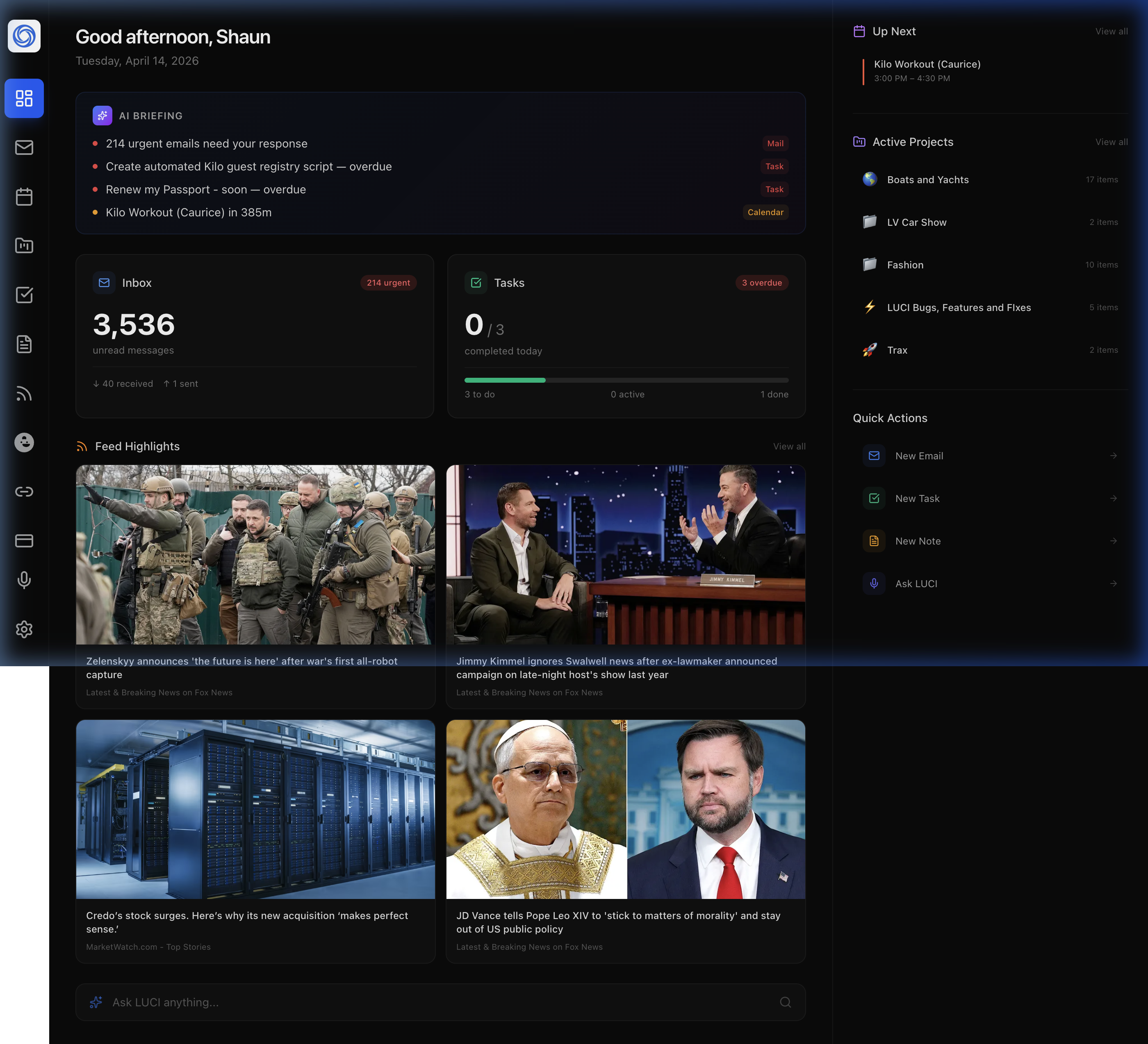 LUCI unifies your email, calendar, tasks, notes, projects, and content feeds into a single AI-powered workspace — so you can focus on what actually matters.