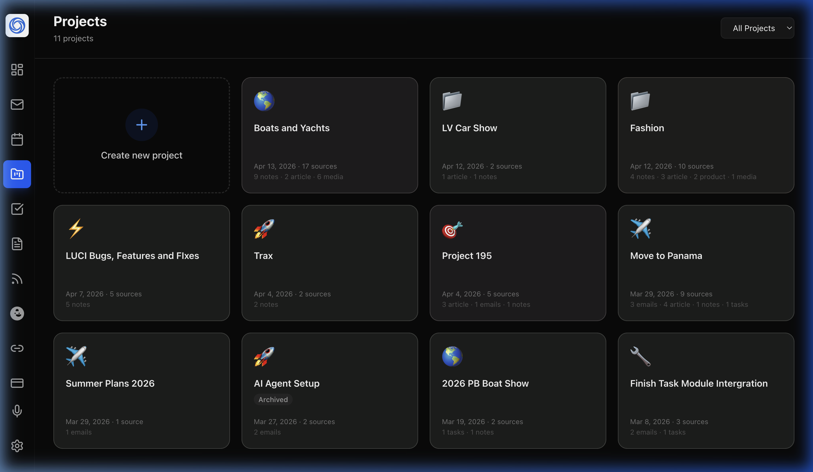 Group emails, notes, articles, tasks, and media under rich project workspaces. LUCI auto-detects YouTube links and fetches transcripts, so all your research lives in one place.