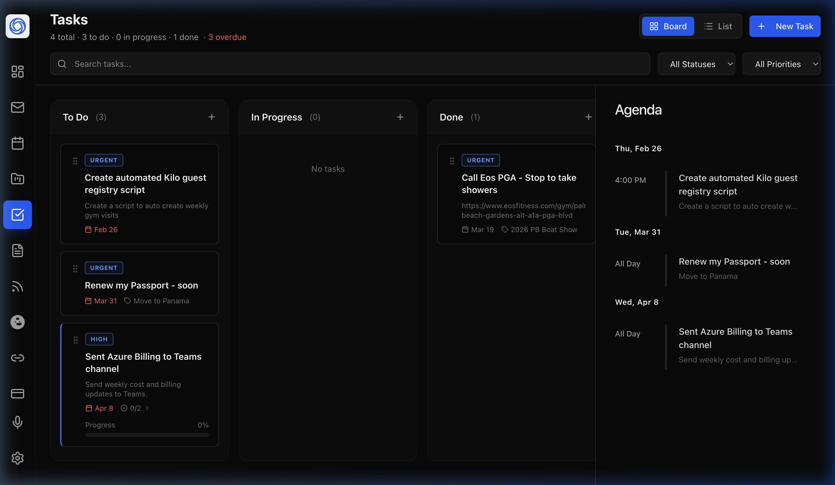 A full Kanban board with Board and List views, priority labels, sub-task progress tracking, and an Agenda sidebar — so you always know what's due and what's done.